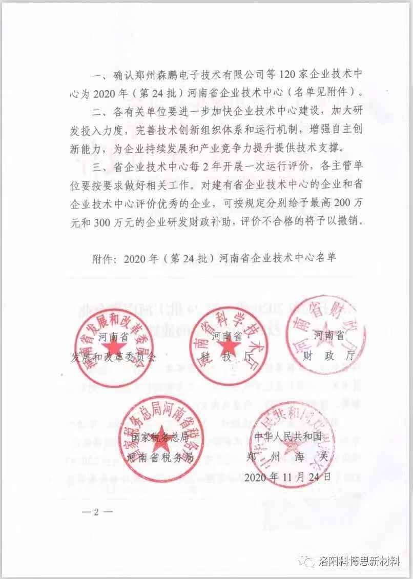 近日,河南省發(fā)展和改革委員會(huì )下發(fā)了《關(guān)于發(fā)布2020年(第24批)河南省企業(yè)技術(shù)中心名單的通知》(豫發(fā)改高技〔2020〕919號),經(jīng)過(guò)評審、考察、公示等環(huán)節,洛陽(yáng)科博思新材料科技有限公司從全省多家企業(yè)脫穎而出,順利通過(guò)第24批省級企業(yè)技術(shù)中心認定,這是公司在2018年被認定為洛陽(yáng)市企業(yè)技術(shù)中心后的又一突破。